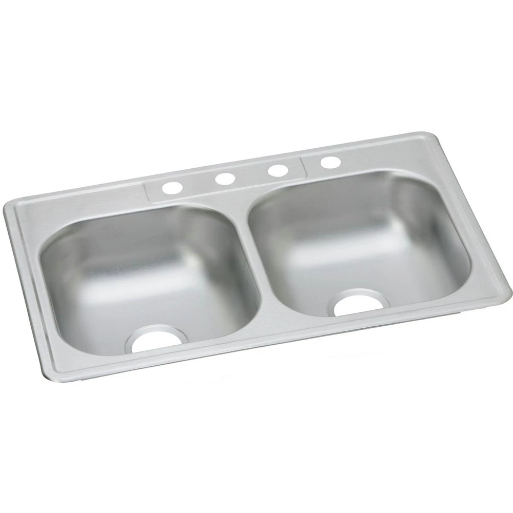 - Dayton 33 in. x 22 in. x 6-9/16 in. Equal Double Bowl Drop-in Stainless Steek Sink – D233224