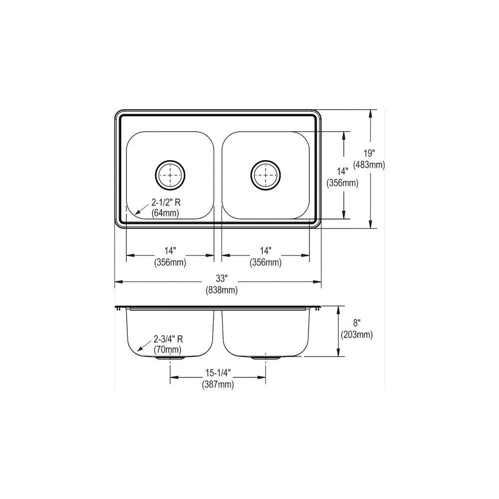 - Coved Corners: 2-1/2″ (64mm) vertical radius and 2-3/4″ (7 mm) horizontal radius