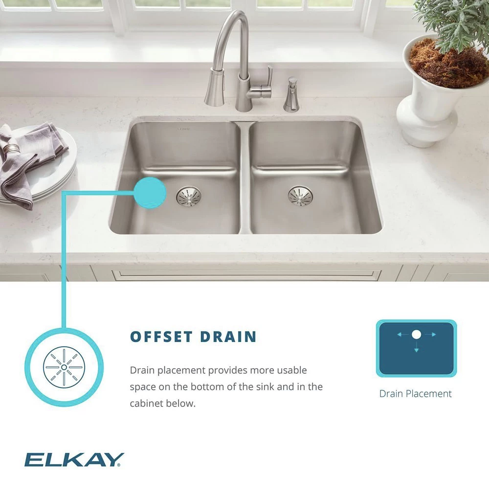 - OFFSET DRAIN: Drain placement provides more usable space on the bottom of the sink and in the cabinet below.