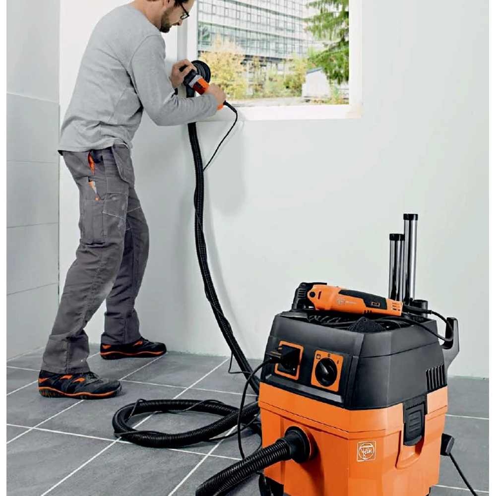 The FEIN Turbo Vacuums are sophisticated professional tools for effective dust extraction from power tools and to clean workplaces, both in the shop and on-site. The lightweight, robust FEIN Turbo vacuums set standards in the compact vacuum class by being incredibly powerful and versatile. Due to their compact size, they ensure effective dust extraction, even in tight conditions. The FEIN Turbo Vacuums offer a convenient and practical accessory storage area.